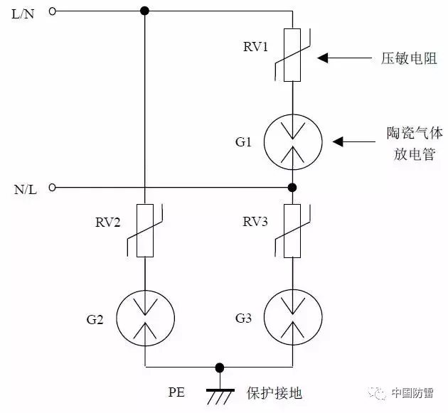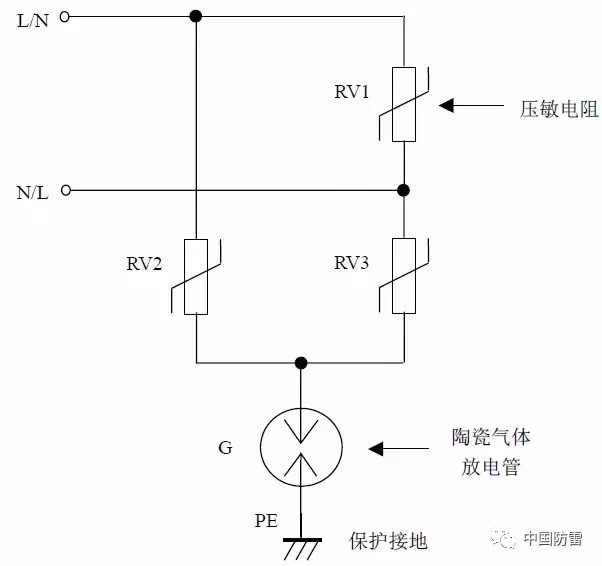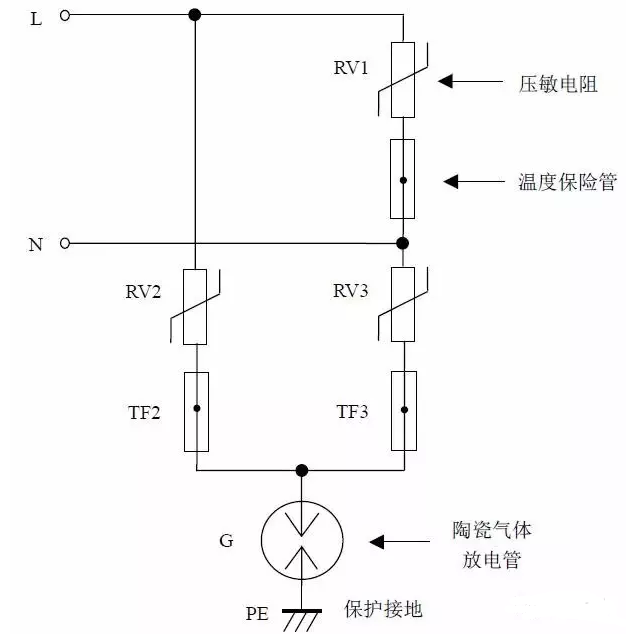 缺点:压敏电阻RV1 短路失效后易引起火灾。最好在每个压敏电阻上串联一个工频保险丝以防压敏电阻短路起火。如果L、N 线不可能接反,则可省去压敏电阻RV2、RV3,将放电管G 的上端直接接到N 线上,构成“1+1”电路。