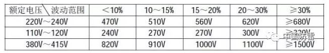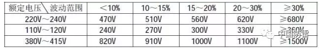 2、压敏电阻的压敏电压值参照下表选取(选压敏电压高一点的更安全、耐用,故障率低,但残压略高);根据通流容量要求选择外形尺寸和封装形式,或采用几个压敏电阻并联(应挑选压敏电压相近的并联,以延长使用寿命和确保安全)。