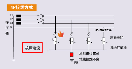 上图是三相电源防雷器4P的接线图,SPD直接连接在相线与地线之间,其回路阻抗主要是接地电阻,不同的地方接地电阻值往往有很大的差异。当电网发生故障时,形成的故障电压长期高于电源防雷器的最大持续工作电压Uc,导致浪涌保护器损坏产生回路故障电流。在接地电阻值过高或地线接触不良的情况下,流经浪涌保护器的短路电流很小,不足以使前端过电压保护装置断开,最后可造成防雷器损坏甚至起火。