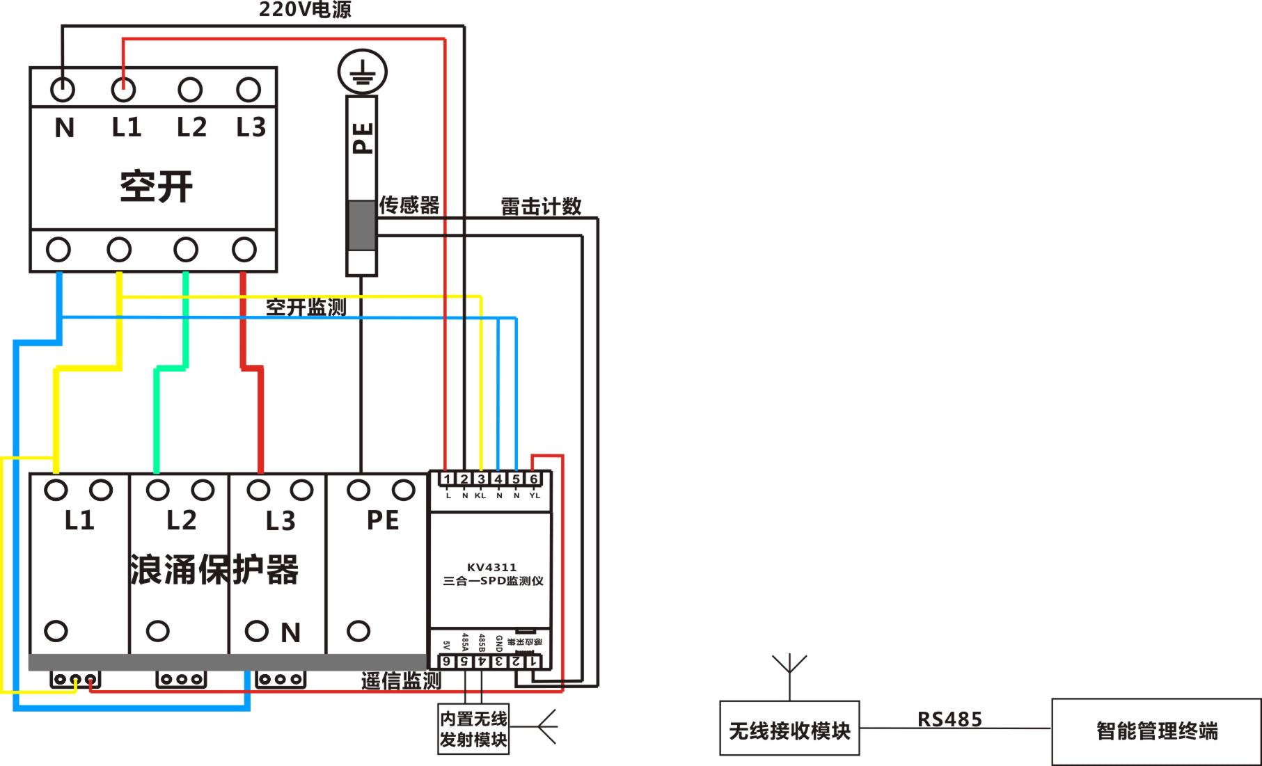 1个SPD遥信检测,1个空气开关的状态检测,一路雷击计数,一路RS485通信,220V供电