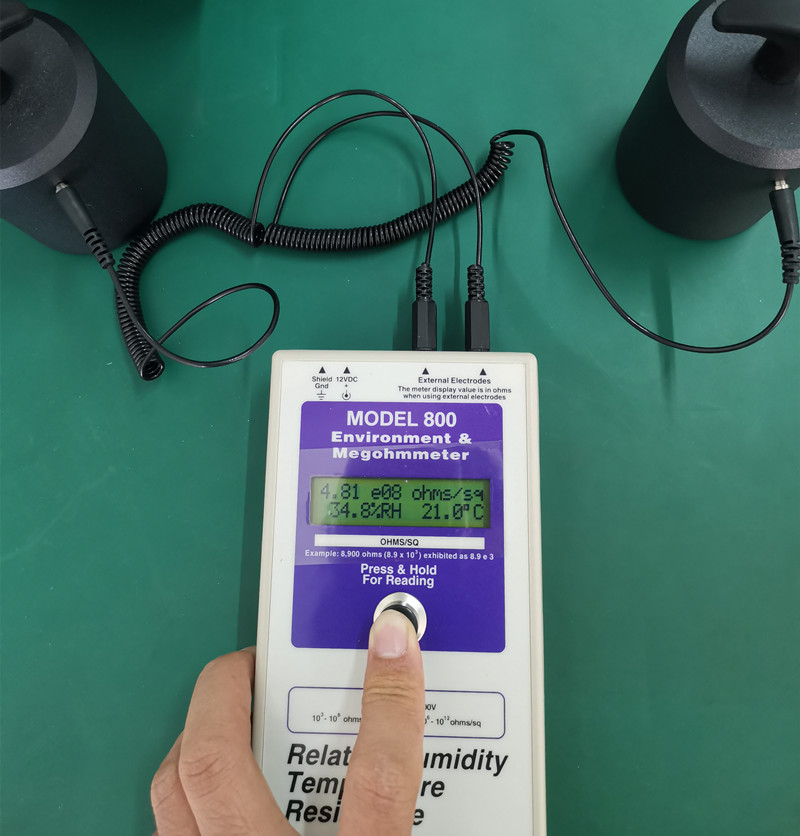 概述ACL-800 产品应用: ACLL-800 兆欧表测量表面电阻采用并行电极和同心环。测试对地电阻(RTG),电阻两点之间(RTT),体积电阻使用25磅的。2.5“光盘探针,的电阻率,电阻测试过程中的湿度和温度。ACL-800测试各套服装连续性除了执行耗散座位的测试。符合ANSI / EOS/ ESD(S4,S7.1,S2.1,S12),ASTM-F150,标准和NFPA99A标准。 ACL-800 兆欧表的设计质量检查传入地面饰面,地板垫,餐桌垫,导电地砖,如材料工作表面,油漆,包装袋,腕带,常见的点接地线,鞋类,包装材料,服装,防静电椅子,静态控制的地区。应用范围包括工程,维护,质量控制,来料检验,制造和培训。操作方法 测量前,首先确保待测表面干净无污染。一、表面阻抗:(Surface Resistivity) 1 、平行探头阻抗测量法(Parallel Probe Resistivity Method)平行探头阻抗测量法是符合EOS/ESD-S11.11-1993标准的测量方法,这是一种快速的测量平面均匀材料电阻值的方法。这种方法也适合于多层材料的测量,但是在阻抗值报告中必须注明测量时的温度和湿度条件。 A 、将表放在待测量的物体表面。B、将开关调到所需的电压位置(10伏或100伏)C、以大约5磅的压力持续按下测量按钮,此时LCD屏会显示出测量的表面阻抗,温度和相对湿度值,整个测量过程大约为十五秒种。·表面阻抗单位为欧姆/□·温度单位为摄式·相对湿度单位为百分比 在每次测量中,按下测量按钮后,ACL-800表将连续显示修整测量值,松开按钮后约四十五秒内,显示的是**一个测量值。 2 、同心环探头阻抗测量法(Concentric Ring Probe Resistivity method)(同心环探头为选购件) 将连线插头插入表的两个3.5毫米插孔,并将香蕉插头与同心环探头 (选购件)相联。将探头放在待测试物体表面后,按下按钮约15秒钟后,在液晶显示屏上将显示出正确的温度和相对湿度,正确的表面阻抗值为液晶显示屏上的读数乘以10,单位为欧姆/□。 例如:晶屏上显示为3.5×104欧姆/sqr;实际阻抗值为3.5×105欧姆。更多技术问题请咨询客服。
