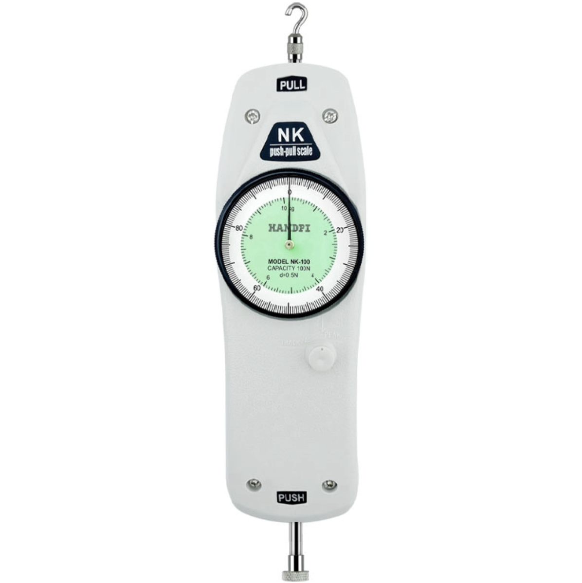 0-500N,推拉功能,指针式。两种单位,5种测试头