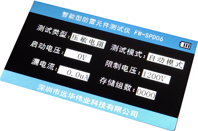 说明书下载 FW-SPD06智能型防雷元件测试仪又名防雷元件测试仪、SPD现场测试仪,用于避雷器、防雷器、浪涌保护器、压敏电阻、金属陶瓷放电管、直空避雷管等性能测试的专用仪表。本仪表采用充电功能离线使用克服了传统产品要插电使用不方便现场操作的缺点、电压输出2000V应用范围更加广泛、使用高压短路保护、自动放电功能、仪表可靠安全耐用。同时具备绝缘电阻测试功能、采用豪华大彩屏幕显示、数据存储、数据查阅、合格判断、自动关机、USB数据上传等功能。整机美观高档,量程宽广,分辨率高,操作便捷,携带方便,准确、可靠、性能稳定,抗干扰能力强。 FW-SPD06智能型防雷元件测试仪具有防震、防尘、防潮结构,适应恶劣工作环境,是气象防雷、电力、邮电、通信、机电安装和维修以及利用电力作为工业动力或能源的工业企业部门常用而必不可少的仪表。它适用于测量各种避雷器和浪涌保护器的性能参数测试。 FW-SPD06智能型防雷元件测试仪由中大规模集成电路组成。本表输出功率大,起始动作电压测量范围:0-2000V,漏电流测量范围:0.1~199.9uA,绝缘电阻:0~1000MΩ,重复稳定性好,一键测量方便快捷。 功能 压敏电阻(MOV)起始电压漏电流测试、放电管(GDT)放电电压测试、绝缘电阻测试 基准条件 23℃±5℃,75%rh以下 测量电压(V) 0~2000V 精度±2%rdg±3dgt 测量漏电流(uA) 0.1uA~199.9uA 精度±3%rdg±5dgt 直流电压分辨率 1V 漏电流分辨率 0.1uA 绝缘电阻 0~1000MΩ 测试稳定时间 ≤3s 放电管电压上升速率 (100±8) V/s 电源 7.2V 大容量充电电池 背光 有,适合昏暗场所使用 USB数据传输 有 显示模式 5寸彩屏TFT液晶 LCD显示尺寸 108mm×65mm 仪表尺寸 240mm (长)×188mm (宽)×85mm (高) 测试线 测试线红色1米,黑色1米 数据存储 500组 数据查阅 数据查阅功能:“MR”符号显示 溢出显示 超量程溢出功能:“OL”符号显示 判断功能 测量值超过设定范围 功耗 待机:150mA Max 测量:880mA Max 质量 1230g(含电池) 电池电压 电池电压不足,显示低电符号 自动关机 仪表无操作15分钟关机 绝缘电阻 ≥50MΩ (1000V) 耐压 AC3kV/50Hz 1min 工作温度和湿度 -10℃~+50℃<85%RH 贮存温度和湿度 -15℃~+55℃<90%RH 适合安规 IEC61010-1、IEC1010-2-31、IEC61557-1,5、IEC60529(IP54)、污染等2、CAT Ⅲ 300V