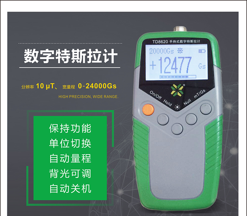 TD8620 手持式数字特斯拉计采用了高灵敏度霍尔传感器和高分辨率的 A/D 转换芯片,应用了流行的单片机技术和数字滤波技术, 具有灵敏度高,读数稳定,功耗低、重量轻等优点,完全符合 《 JJG 242-1995 特斯拉计检定规程 》 、IEC-61010-1 的相关规定。