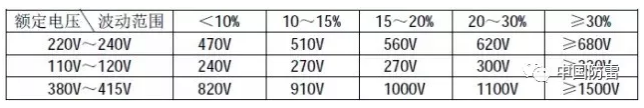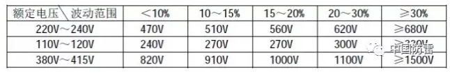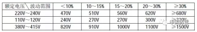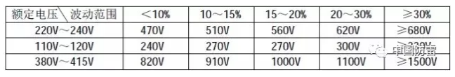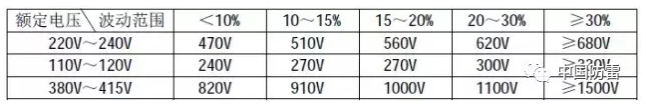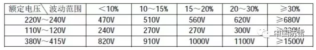 2、压敏电阻的压敏电压值参照下表选取(选压敏电压高一点的更安全、耐用,故障率低,但残压略高);根据通流容量要求选择外形尺寸和封装形式,或采用几个压敏电阻并联(应挑选压敏电压相近的并联,每个压敏电阻都要单独串联温度保险管,以延长使用寿命和确保安全)。