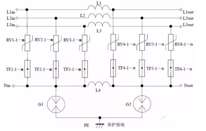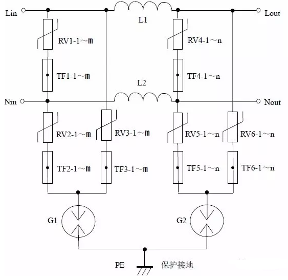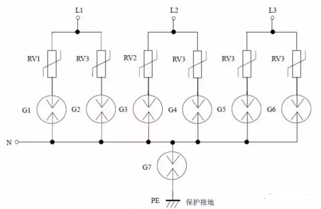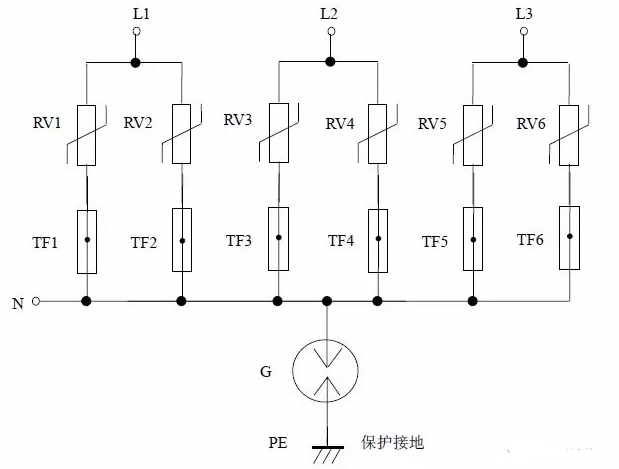 缺点:压敏电阻RV1 短路失效后易引起火灾。最好在每个压敏电阻上串联一个工频保险丝以防压敏电阻短路起火。如果L、N 线不可能接反,则可省去压敏电阻RV2、RV3,将放电管G 的上端直接接到N 线上,构成“1+1”电路。