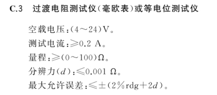 《建筑物雷电防护装置检测技术规范》 GB/T 21431-2023 附录C给出了常用几款仪器的参数,其中等电位测试仪的参数是比较迷惑的,其中要求测试电流≥0.2A