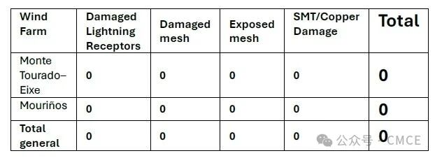 在安装 CMCE Twin Max 系统之前,Monte Tourado-Eixe 和 Mouriños 风电场曾多次遭受雷击。2021 年至 2023 年间,维护团队记录了 74 起与电击直接相关的事件,造成接閃器、保护网以及金属接线端(如 SMT 或铜帽)损坏。这些事件导致风机非计划停机 48 至 72 小时,叶片更换成本高昂,并带来严重的运营风险。